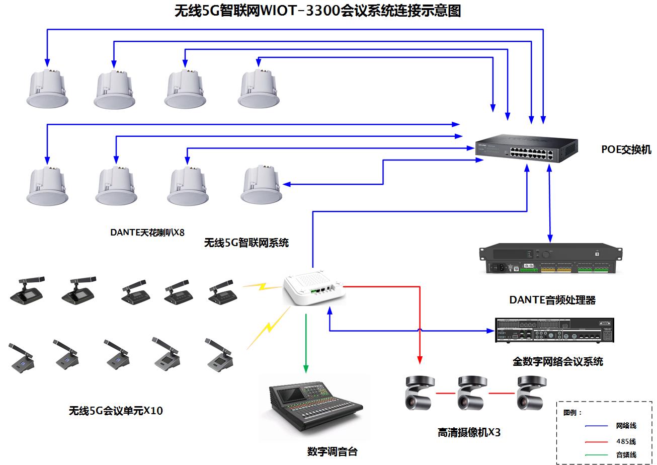 无线5G智联网会议系统WIOT-3300是我们创新产品,可免去烦琐的布线、安装快速方便,操作简单,特别适合项目改造、移动会议,临时设备增加及无法布线等场景使用。系统采用双数字与模拟融合设计,可实现数+数+模三备份,支持DANTE网络协议和HD-Sound网络协议,音频信号互联互通,,PoE供电技术,信电合一,一条网线搭起一套会议系统,双电源冗余技术,确保系统高可靠行,支持摄像跟踪功能等,广泛应用于政府会议室、集团会议室,报告厅及临时会议快速组建。